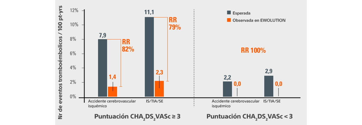 - En pacientes con CHA2-DS2-VASc ≥ 3 se observó una reducción del 82% en accidentes cerebrovasculares isquémicos4 vs. lo esperado.